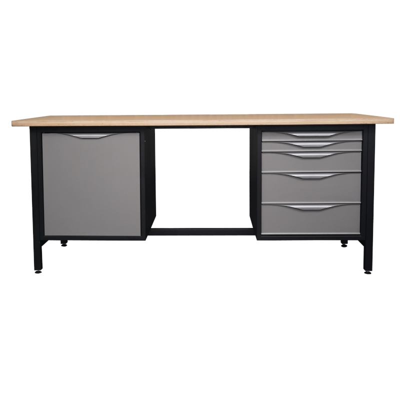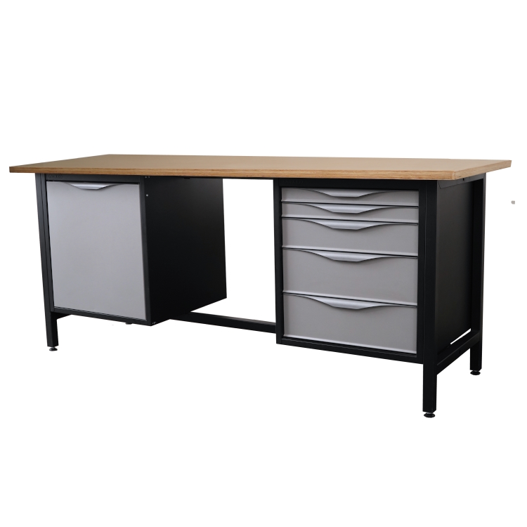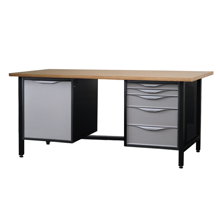 Biurko warsztatowe. Lekki stół warsztatowy z dwiema szafkami: 5 szuflad i schowek z półką.