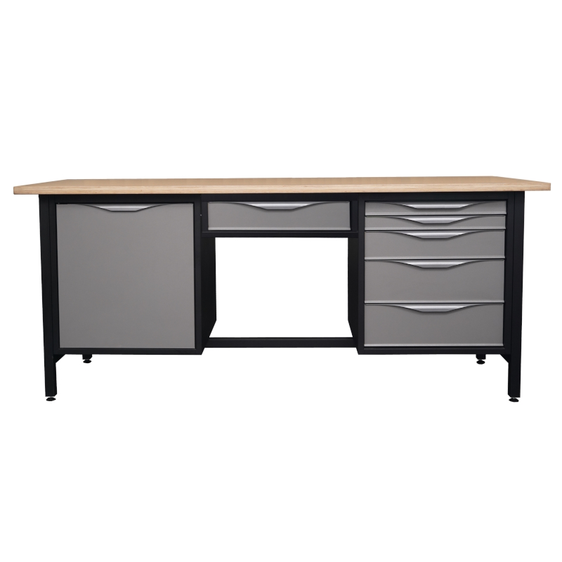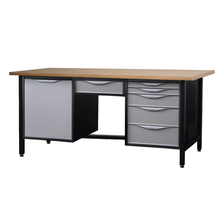 Biurko warsztatowe. Lekki stół warsztatowy z dwiema szafkami i szufladą podblatową.