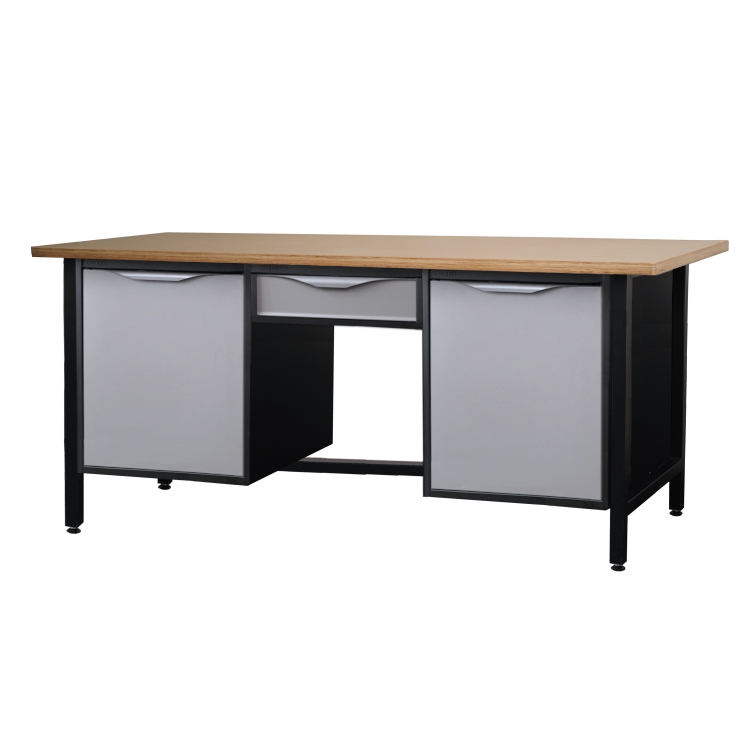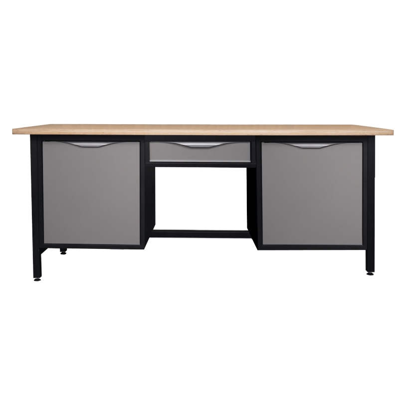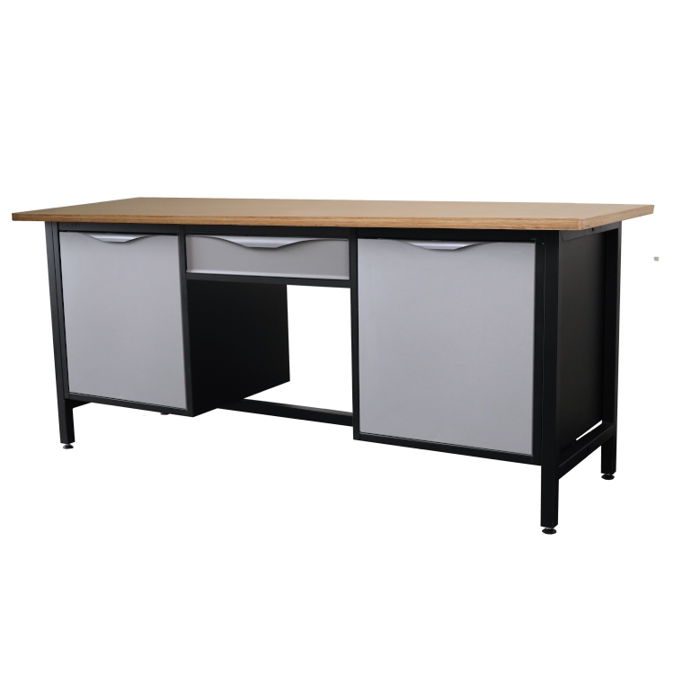 Biurko warsztatowe. Lekki stół warsztatowy z dwiema szafkami z półką i szufladą podblatową.