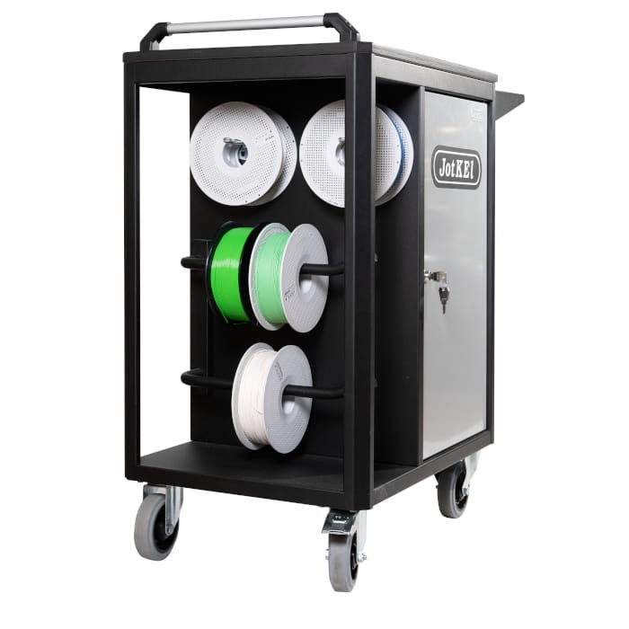 - Pod blatem wózka umieszczone są wygodne uchwyty do zawieszania szpul z tworzywem do drukowania: tzw. filamentem. Dodatkowym atutem jest szafka z dwiema półkami. Można w niej przechowywać dokumentację, akcesoria, narzędzia itp.