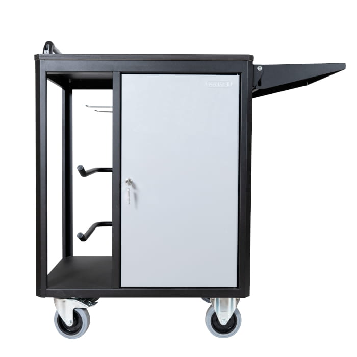 Wózek wyposażony jest także w akcesoria rozszerzające jego funkcjonalność, jak uchwyty na szpule z filamentem, szafka zamykana, dodatkowy rozkładany blat.