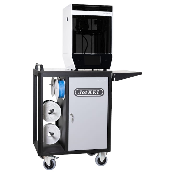 Wózek wyposażony jest także w akcesoria rozszerzające jego funkcjonalność, jak uchwyty na szpule z filamentem, szafka zamykana, dodatkowy rozkładany blat.