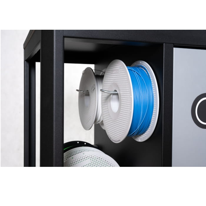 - Pod blatem wózka umieszczone są wygodne uchwyty do zawieszania szpul z tworzywem do drukowania: tzw. filamentem. Dodatkowym atutem jest szafka z dwiema półkami. Można w niej przechowywać dokumentację, akcesoria, narzędzia itp.